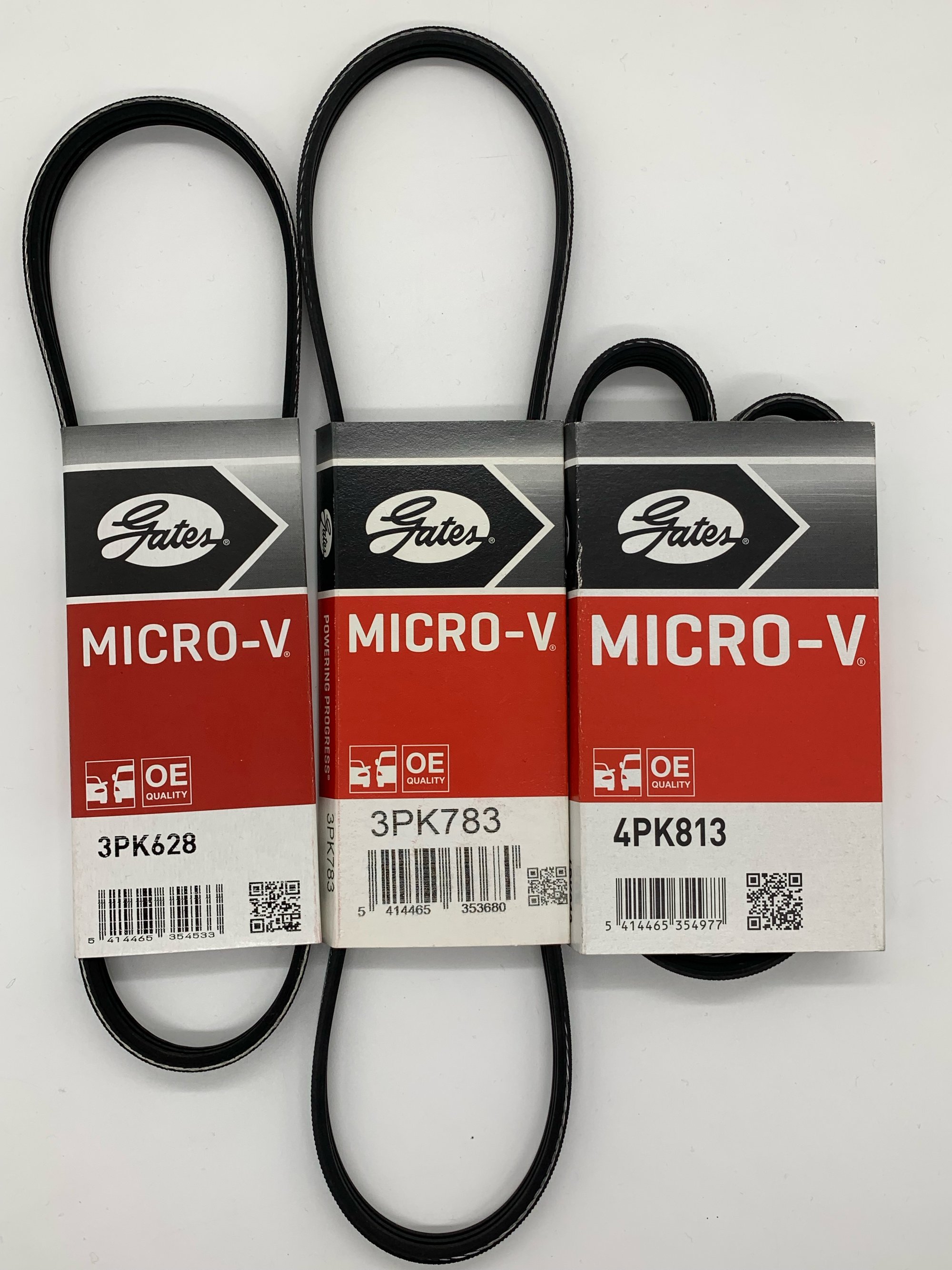 These are the 3 belts essential for keeping your alternator charging, your Power Assisted Steering pump pumping and air conditioning pump helping to keep you cool.