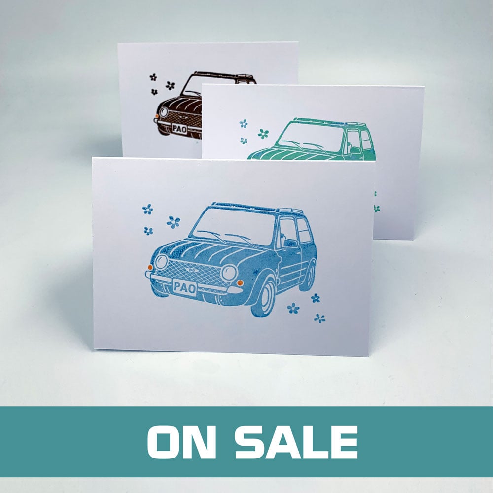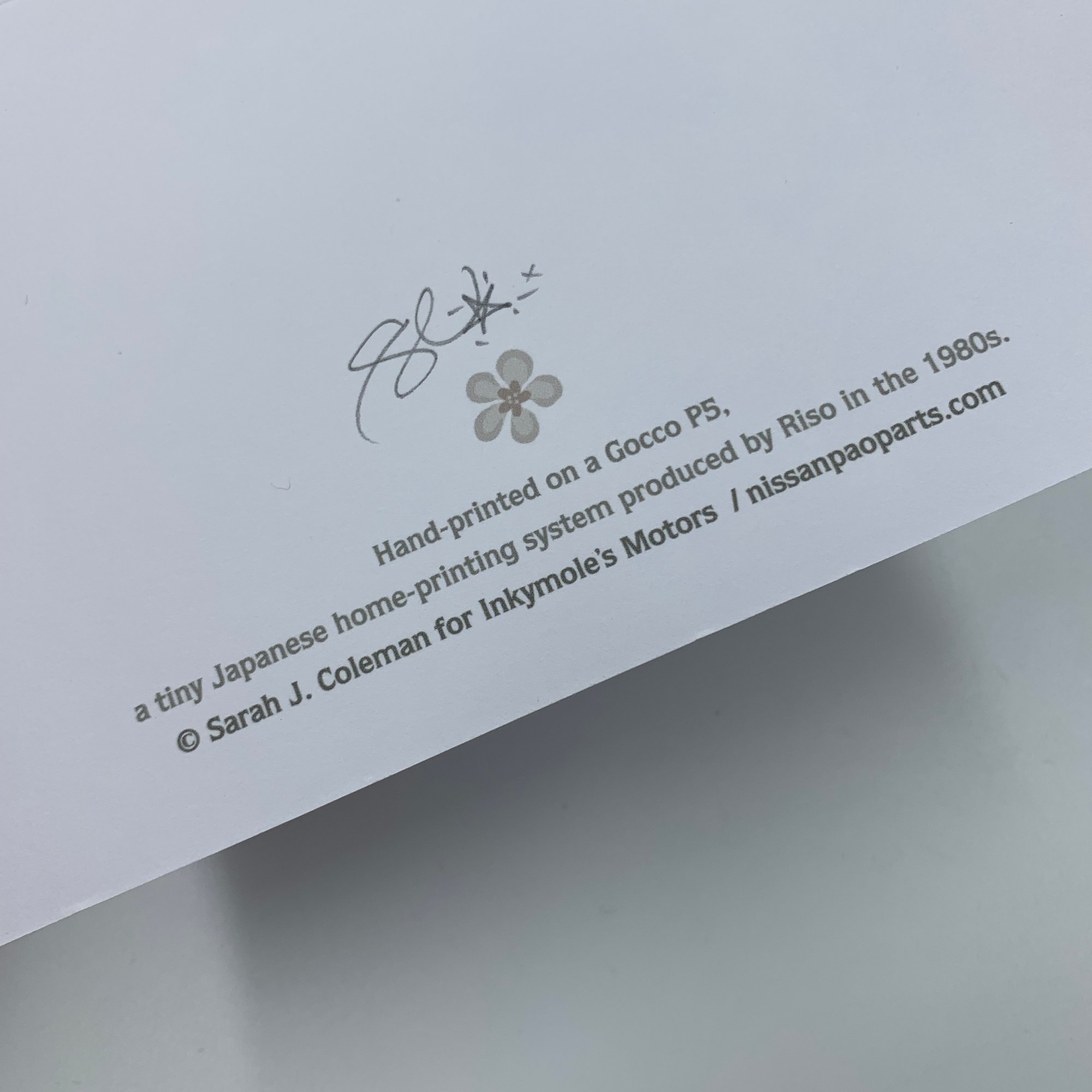 These little cards are individually hand-printed on a tiny, obsolete Japanese home printing machine called the Gocco, launched in the 1980s and a popular relative of its better-known big brother the Riso.